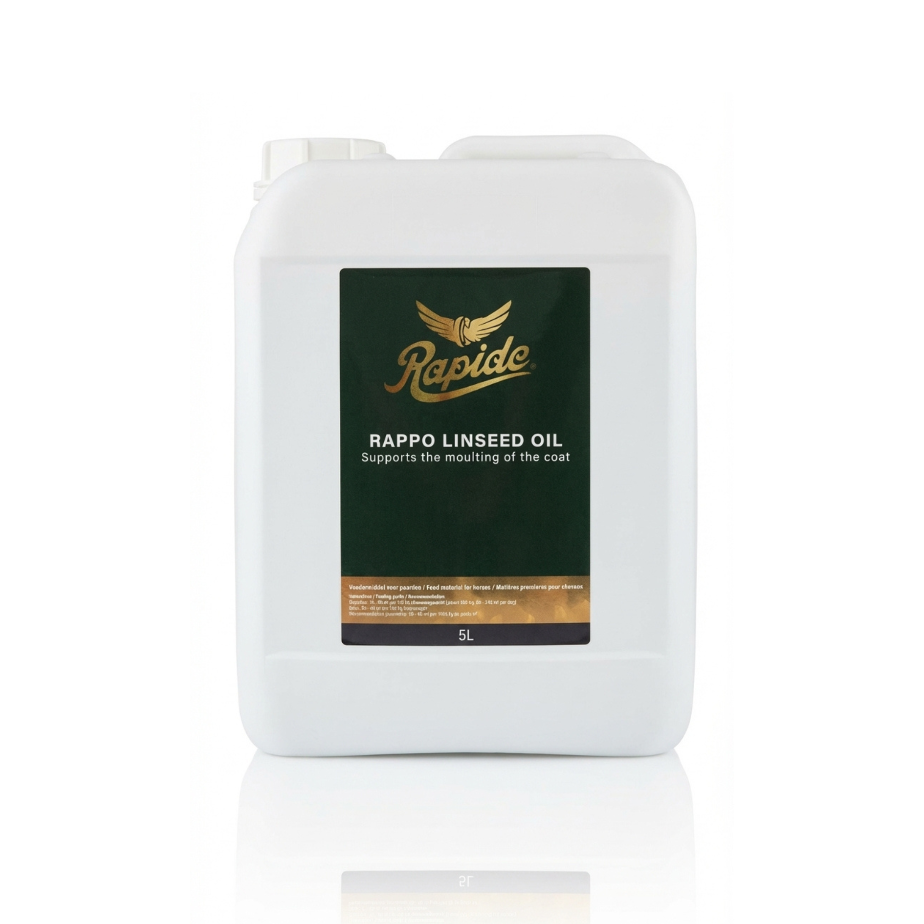 Rappo Lijnzaad Olie 5L is een 100% koudgeperste olie, rijk aan omega-3 vetzuren. Speciaal ontwikkeld voor paarden ter ondersteuning van een gezonde spijsvertering, een soepele verharing en een natuurlijke, stralende glans van de vacht. Vrij van eiwitten en koolhydraten – puur, effectief en onmisbaar in elke stal.