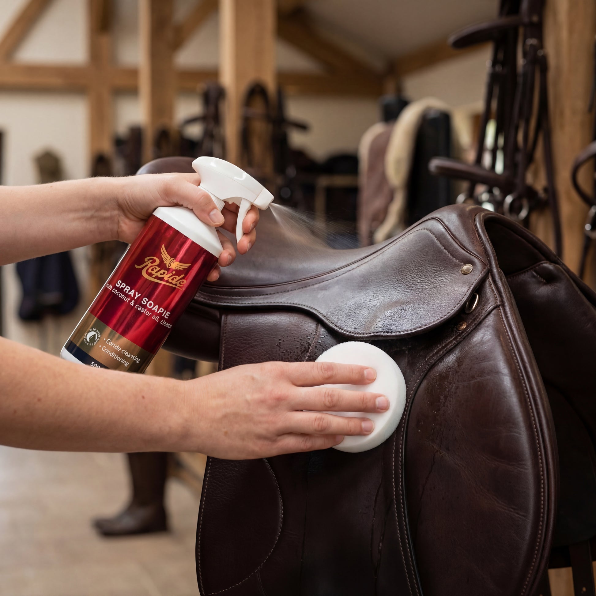 Rapide’s Spray Soapie verwijdert vuil en vet van lederen producten. Eenvoudig in gebruik, zacht voor het leder, droogt het leer niet uit en geeft een mooi eindresultaat. Met kokos- en castorolie.